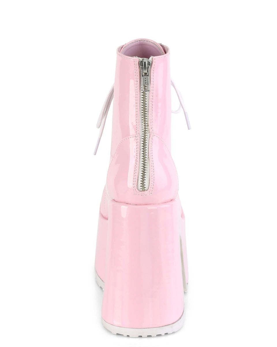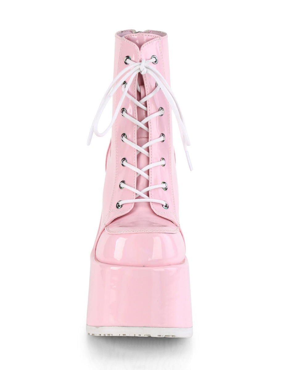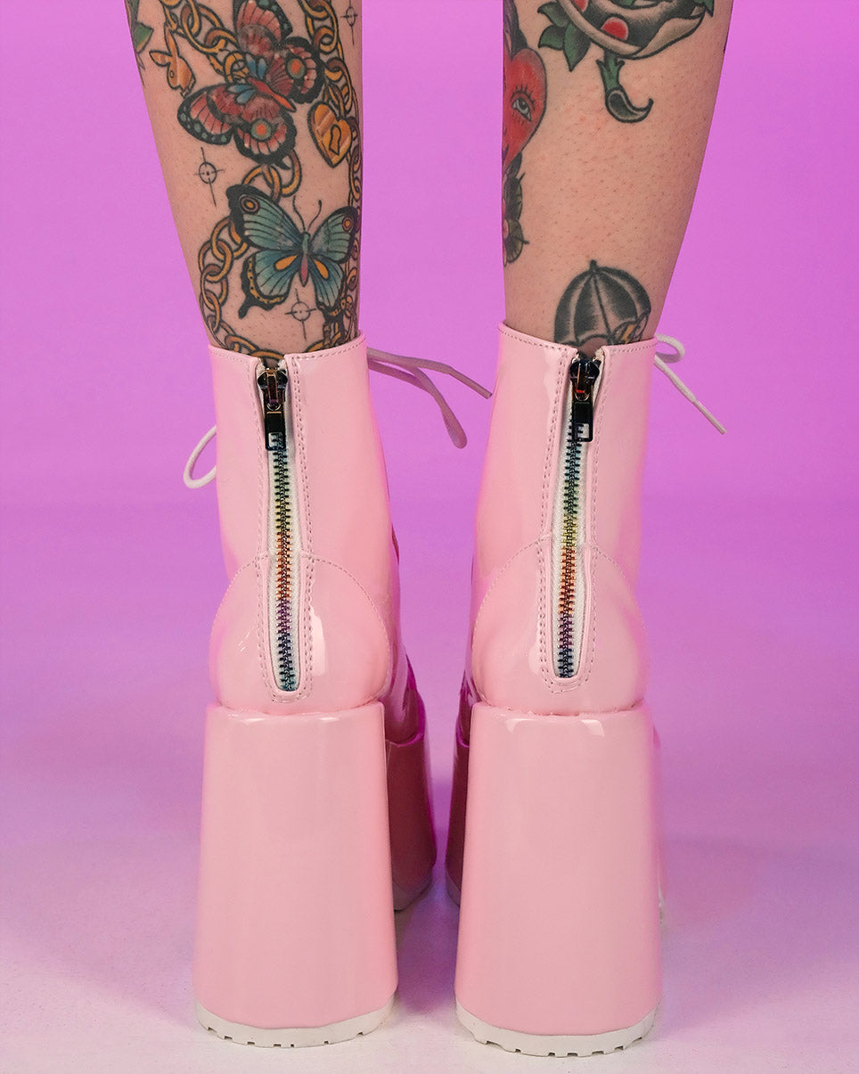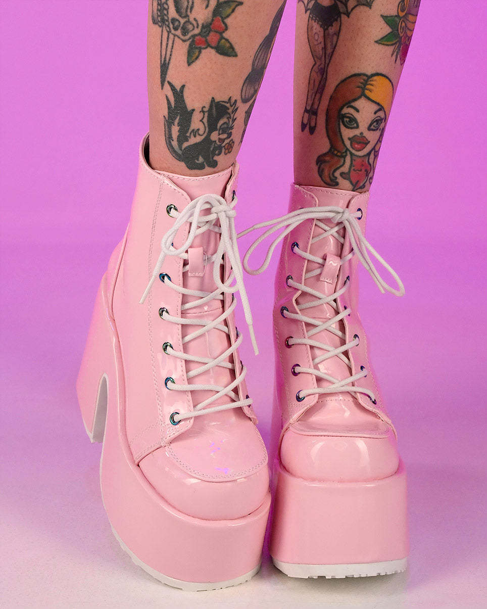 You're guaranteed to stand above the rest in these gorgeous pink holographic lace-up ankle boots. Features full back-zip closure for easy on off wear!